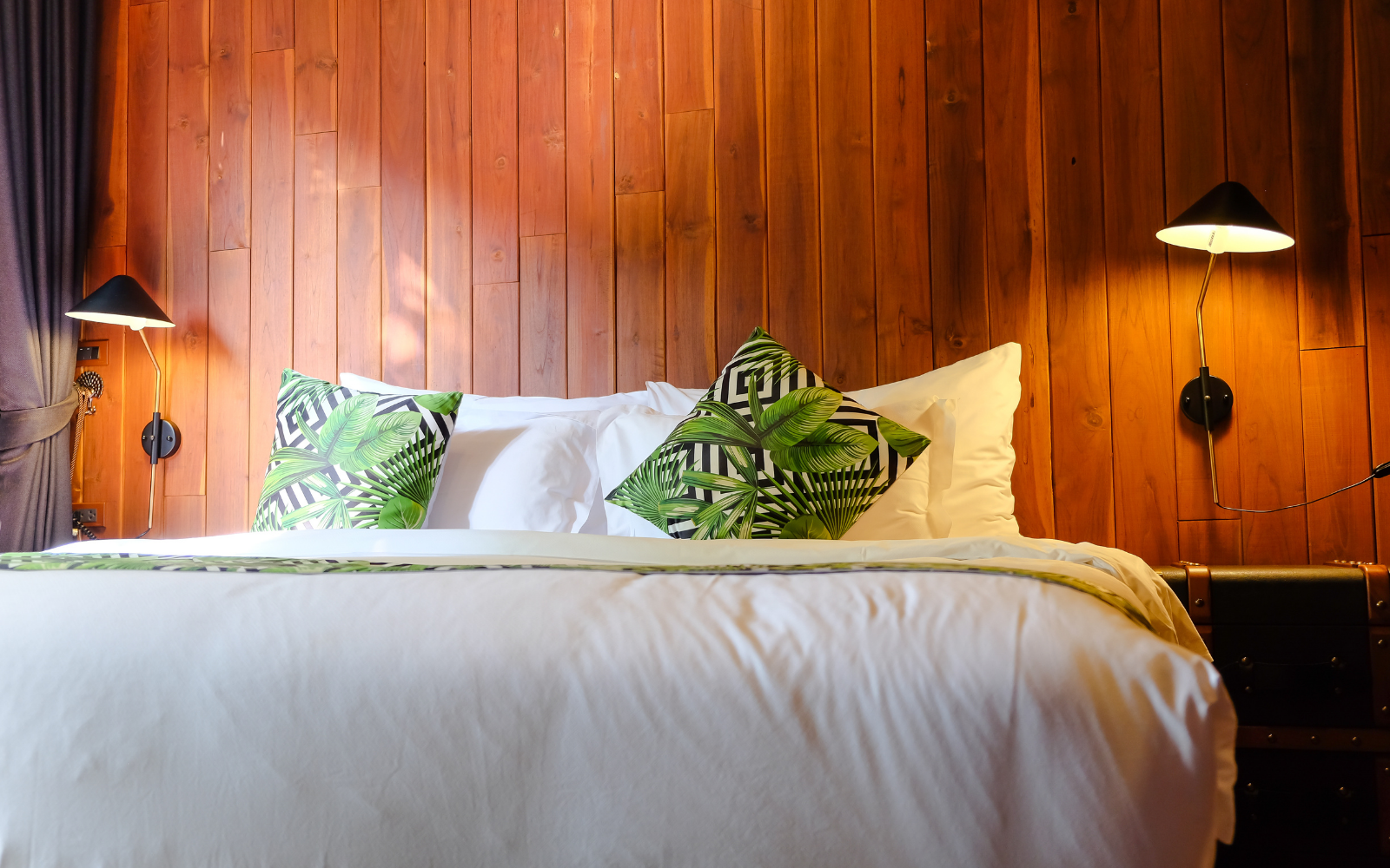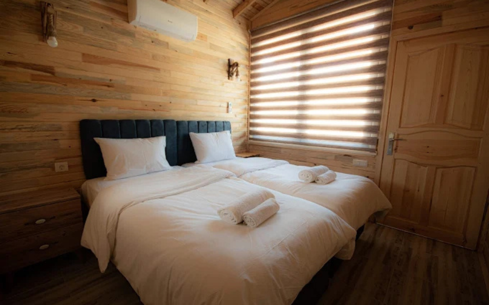 Kendinize ait dağ manzarasına sahip göz alıcı bir çıkma pencereyle birlikte modern tarzda dekore edilmiş etkileyici bir oda tasarımı.